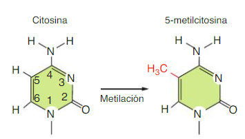 La metilación consiste en la introducción de un grupo metilo en el átomo carbono en posición 5' de la citosina, las cuales forman parte, junto con las guaninas, de las islas CpG (dinucleótidos citosina-fosfato-guanina). Estas islas son reconocidas por las enzimas ADN metiltransferasas (DNMT), encargadas de dicha reacción. [2]